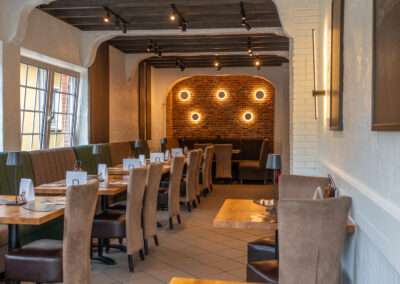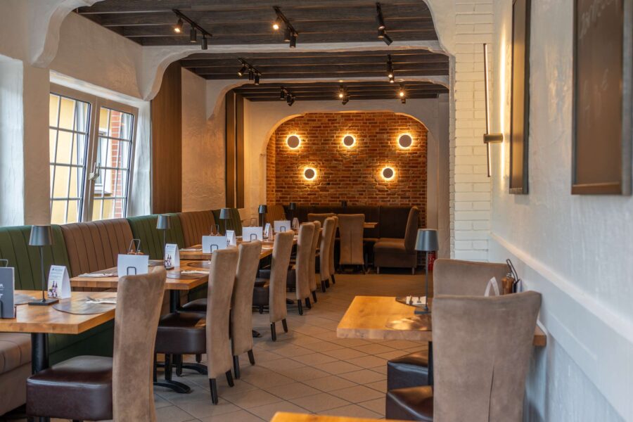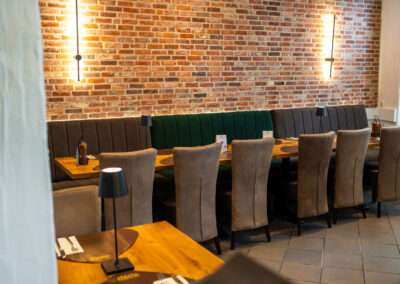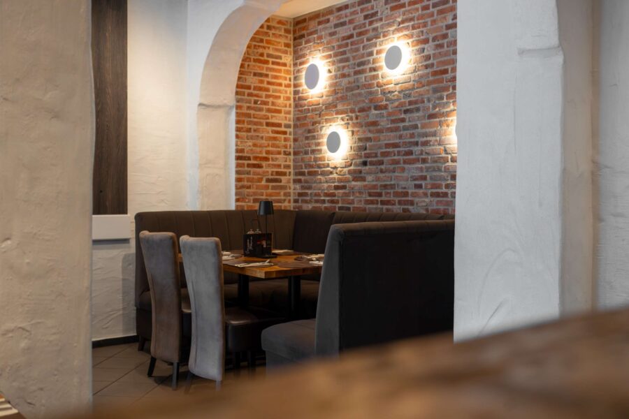 ist im Restaurant Croatia ein Raum entstanden, der Wärme ausstrahlt und sofort einlädt, Platz zu nehmen. Die Ziegelwände aus unserem ReUse Riemchen „Westerhever“ geben dem Restaurant Charakter und schaffen genau die Gemütlichkeit, die zu gutem Essen, einem Glas Wein und gemeinsamen Momenten gehört.